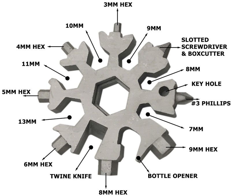 A total of 18 different tools, all in one small, palm-sized snowflake! Including the regular Philips and flathead screwdriver, No. 3, 4, 5, 6, 7, 8 hex keys, and No. 6, 7, 8, 9, 10, 12, 14 wrenches, package opener, and a bottle opener!